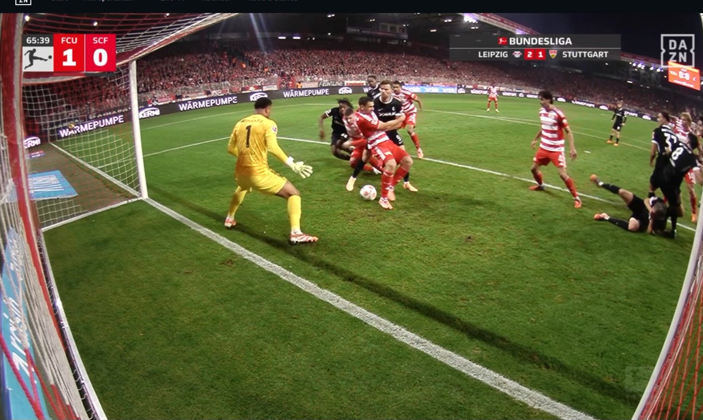 Szene 2: Nach etwas mehr einer Viertelstunde die vermeintliche Führung für Freiburg. Nach einer Ecke von rechts brachte Beste den Ball an den zweiten Pfosten. Dort setzte sich Matthias Ginter im Gerangel durch und köpfte aus fünf Metern links unten ein, Rønnow war ohne Chance. Der Video-Assistent überprüfte das Tor, denn Ginter war wohl mit der Hand an den Ball gekommen und nimmt das Tor wieder zurück. Schiedsrichter Sören Storks mit einer regeltechnischen Erklärung. Ginter hatte das Tor mit der Hand erzielt, dieses zählte damit zu Recht nicht. Bitter ist, dass sich der Freiburger selbst angeköpft hatte. Das war jetzt das erste Mal seit der Stadiondurchsage das ein Schiedsrichter qualitativ hoch gesprochen hat. Das ist ein echter Mehrwert für die Fußballfans beim public announcement.