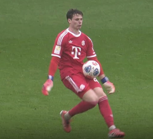Szene 2: Olises Freistoßflanke konnten die Gladbacher im Zentrum verteidigen. Bayern-Keeper Urbig nahm den Ball weit vor dem eigenen Strafraum mit dem Oberschenkel an, dabei sprang ihm dieser an den linken Unterarm. Referee Stegemann ließ weiterlaufen, auch der VAR griff nicht ein. Eine richtige Entscheidung, da der Ball vom eigenen Oberschenkel an den Arm ging und sich dieser recht nah am Körper angelegt war. Somit war es keine unnatürliche Verbreiterung der Körperfläche und kein strafbares Handspiel. Zusammengefasst: Der Ball prallt vom eigenen Körper (Oberschenkel) an den in normaler Haltung anliegenden Arm, weshalb die Fläche nicht vergrößert wird. Würde der Arm seitlich abgestreckt sein, wäre es unnatürlich und strafbar.