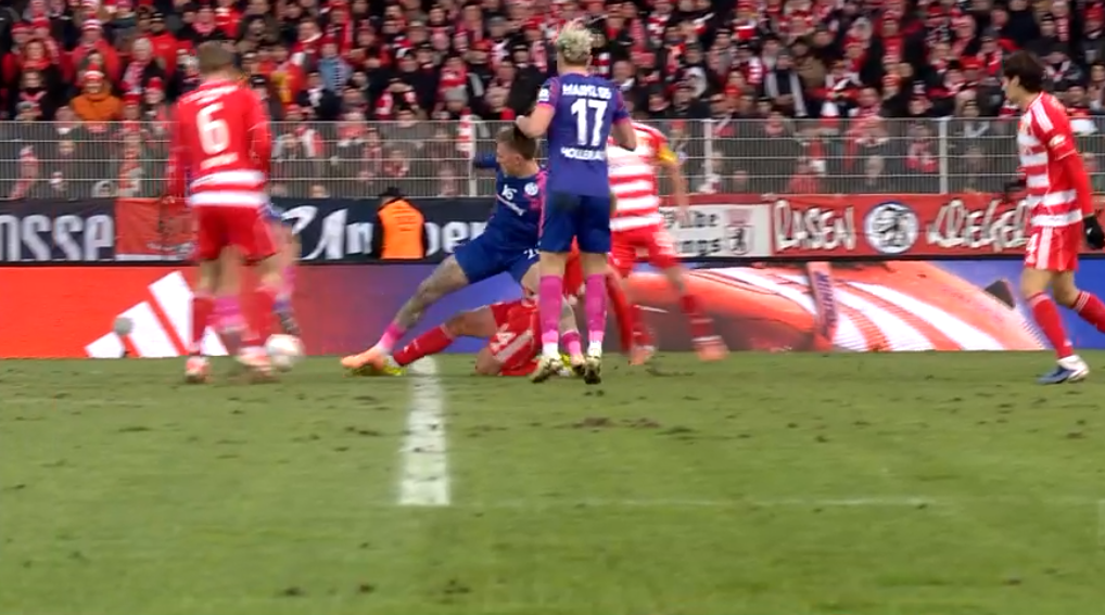 Szene 4: Leopold Querfeld geht von hinten konsequent gegen den frisch verpflichteten Mainzer Stürmer Phillip Tietz in den Zweikampf – und das mittig direkt an der eigenen Strafraumgrenze (also knapp außerhalb des Sechzehners, wahrscheinlich 17 Meter zum Tor). Querfeld trifft den Ball klar und sauber (kein reines Mann-Foul, sondern Ballführung + Gegenspieler-Kontakt). Er kam von hinten, ist aber nicht rücksichtslos oder mit gestrecktem Bein unterwegs – eher ein typischer Verteidiger-Zweikampf am Rande des Erlaubten. Kein Elfmeter – und das ist auch völlig unstrittig. Der Schiedsrichter ließ laufen oder pfeift höchstens Freistoß für Mainz, aber definitiv kein Strafstoß. Insgesamt: Sehr gute, mutige Aktion von Querfeld – er riskierte viel, belohnt sich aber mit Ballgewinn und verhindert eine hochkarätige Chance für den neuen Mainz-Stürmer. Solche Zweikämpfe genau an der Strafraumkante entscheiden oft Spiele in engen Partien wie diesem. Im Zweifel eher laufen lassen.