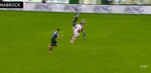 Szene 10: In Minute 25 zeigte Schiedsrichterin Lutz dem Stuttgarter Lauri Penna die gelbe Karte – und diese war sehr umstritten. Penna brachte kurz vor dem Strafraum seinen Gegenspieler zu Fall und sah für das Verhindern einer aussichtsreichen Offensivaktion die Gelbe Karte. Für mich ist das eher Rot. Die Mitspieler von der Seite konnten zwar nicht mehr eingreifen, allerdings hat sich der Angreifer den Ball zu weit vorgelegt, sodass der Torwart eine Chance hatte vorher an den Ball zu kommen. Wird es aber verneint, dass der Torwart vorher nicht mehr an den Ball kommt, muss sie Rot geben, was für mich auch zum Zeitpunkt des Fouls auch die richtige Entscheidung gewesen wäre.