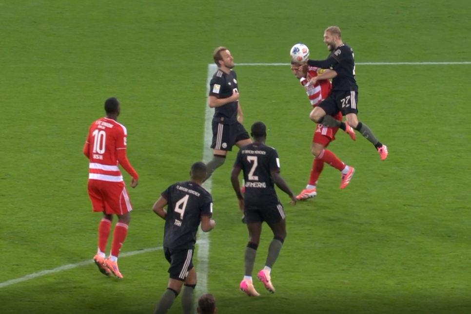 Szene 3: Nachj einem fälligen Freistoß gingen die Köpenicker erneut in Führung! Dabei landet der Juranović-Freistoß vom linken Flügel eigentlich genau im Bayern-Pulk. Kane köpfte jedoch völlig fahrig Doekhi an, der sich die Kugel mit dem Oberschenkel selbst vorlegte und dann geistesgegenwärtig mit links aus gut sechs Metern im rechten unteren Eck einschob. Da kann auch Neuer nichts mehr machen und der VAR nicht mehr machen, denn es war alles sauber. Weder Abseits, noch ein Handspiel, der er sich den Ball mit dem Oberschenkel selbst an die Hand spielte.