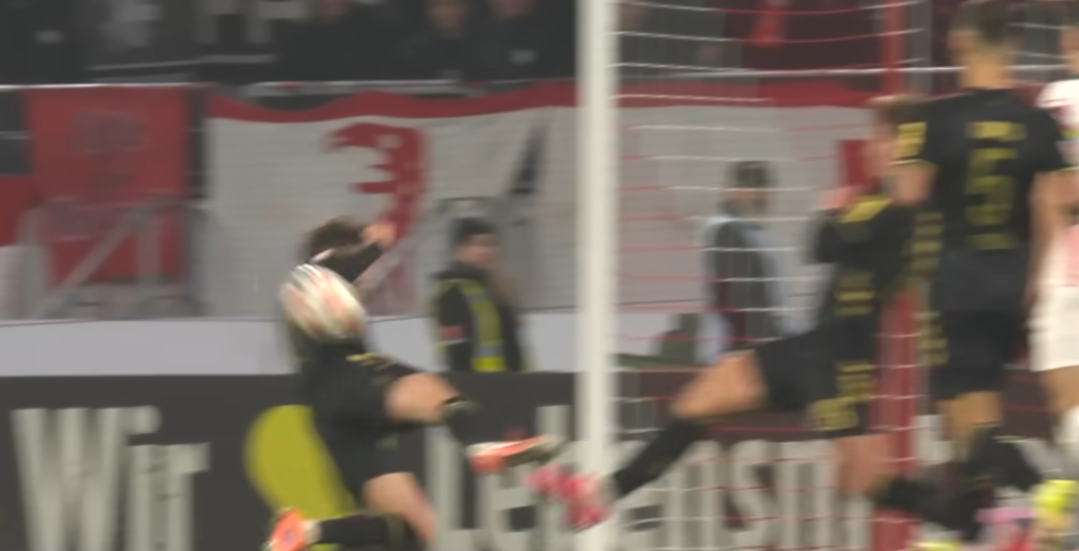 Szene 3: Igor Matanović (Freiburg) zog zentral aus dem Strafraum ab. Der Ball traf zuerst Castro-Montes an die Hüfte/Oberschenkel. Von dort prallte er an den abgespreizten Arm des Kölners. Schiedsrichter Bastian Dankert entschied auf Handspiel → Elfmeter für Freiburg. Gleiche Begründung wie der Handelfmeter in Gladbach. Der Arm ist in einer unnatürlichen Armhaltung indem er nach oben gehalten. Der Arm macht den Körper unnaturally bigger → Handspielvergehen, auch wenn der Ball nicht direkt vom Arm kommt, sondern abgelenkt wird. Die IFAB-Regel unterscheidet hier nicht streng „direkt vs. abgelenkt“ – entscheidend ist die unnatürliche Armposition im Treffmoment, da er bereits vor dem Armkontakt seinen Körper verbreitert hat, ist die regeltechnische korrekte Entscheidung der Handelfmeter. [TV-Bilder – ab 06:27 Minuten]